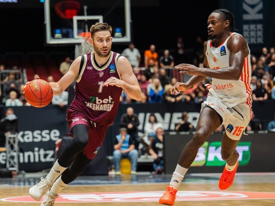 Pirmuosius taškus mače pelnė Lazaras Mutičius, bet keliomis sėkmingomis atakomis atsakė šeimininkai – 6:2. Atsilikimą vėl mažino L.Mutičius (4:6), tačiau „Niners“ vėl buvo tikslūs – 10:4. Tritaškį realizavo Kristianas Kullamae (7:10), o Chemnico komandoje tikslus buvo Kevinas Yebo – 15:9. Po Gabrieliaus Maldūno sėkmingų epizodų rezultatas tapo lygus (15:15) , tačiau „Niners“ kėlinio pabaigoje surengė spurtą 13:2 ir atitrūko dviženkle persvara – 28:17.
