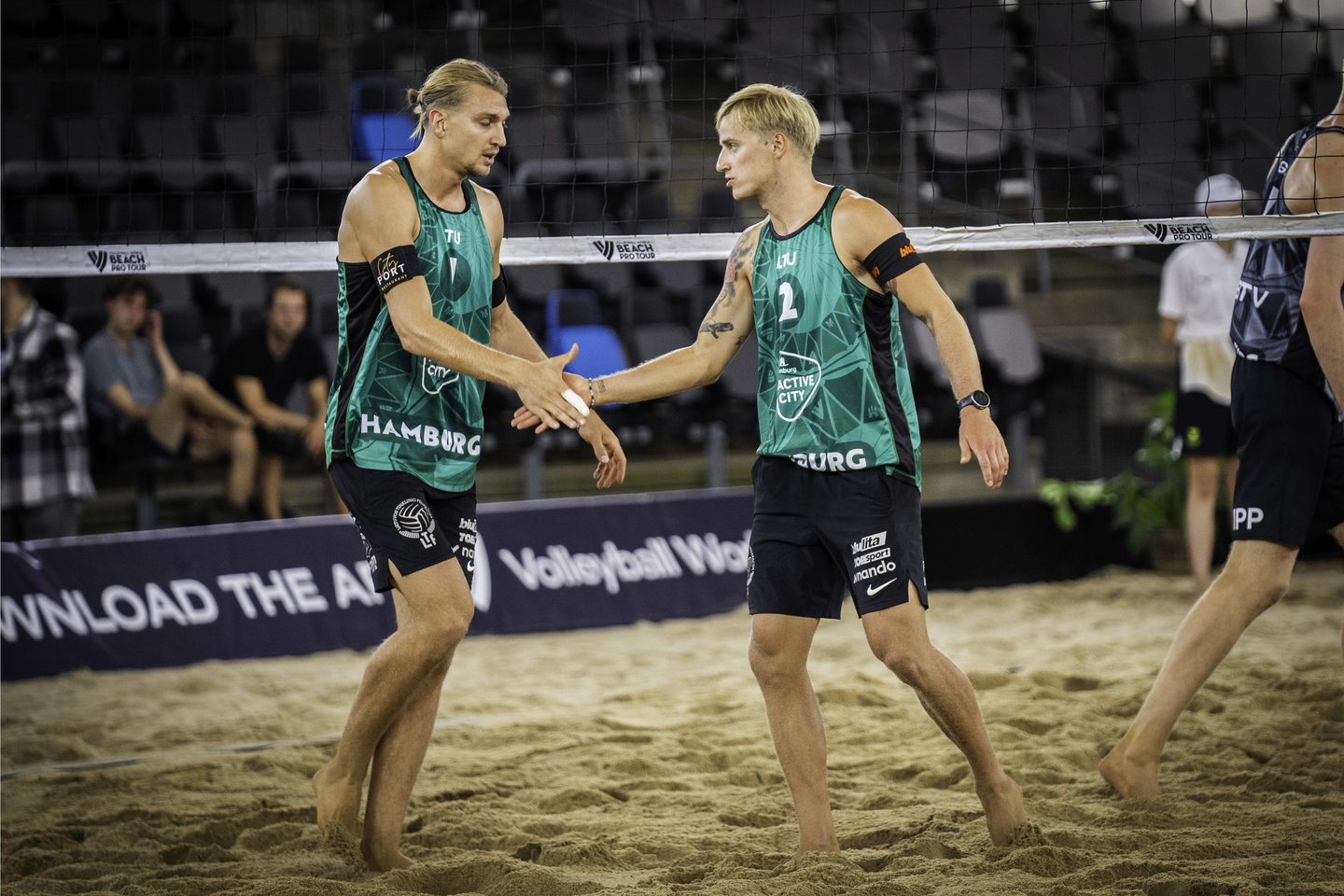 Vyrų turnyro aštuntfinalyje lietuviai Patrikas Stankevičius ir Audrius Knašas po beveik valandą trukusios kovos 1-2 (21:19, 17:21, 9:15) pralaimėjo broliams iš Anglijos Javierui ir Joaquinui Bello.
