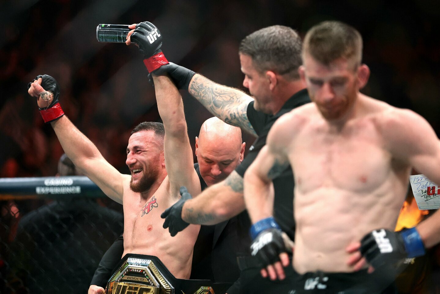 Merabas Dvališvili nugalėjo Cory Sandhageną vieningu teisėjų sprendimu (49–45, 49–45, 49–46).