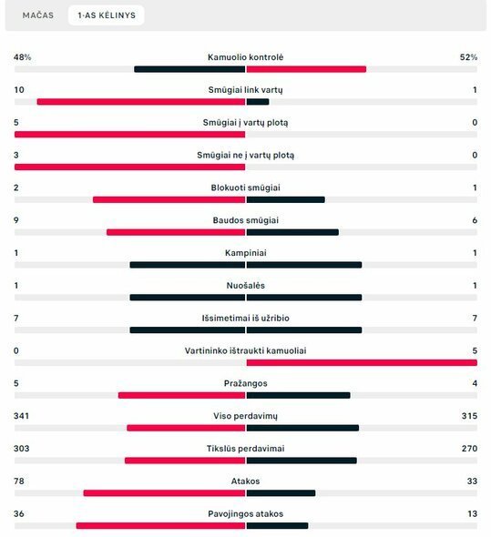 10 min. Abi ekipos per pirmąsias dešimt susitikimo minučių žaidė itin atsargiai ir nė viena nesmūgiavo į vartų plotą.