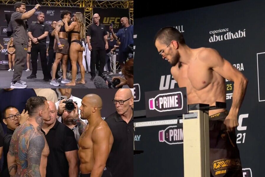 Šiek tiek problemų metant svorį kilo Umarui Nurmagomedovui. Dagestanietis ant svarstyklių lipo su akiniais nuo saulės ir atrodė pasitikintis savo jėgomis, tačiau svėrė 61,92 kg – 0,23 kg daugiau nei leistinas svoris netitulinėje šios svorio kategorijos kovoje.