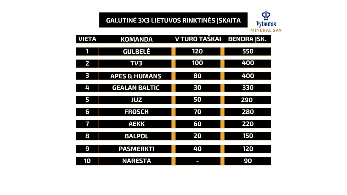 Bendroje įskaitoje „Gulbelė“ surinko 550 taškų ir nuo artimiausių persekiotojų nutolo per 150 įskaitos taškų. Po 400 taškų surinko „TV3“ ir „Apes&Humans“ komandos, tačiau antrą vietą už geresnį pasirodymą paskutiniame etape gavo „TV3“ komanda, kuri vasarą taip pat gins Lietuvos garbę ir dalyvaus Europos žaidynėse Minske.