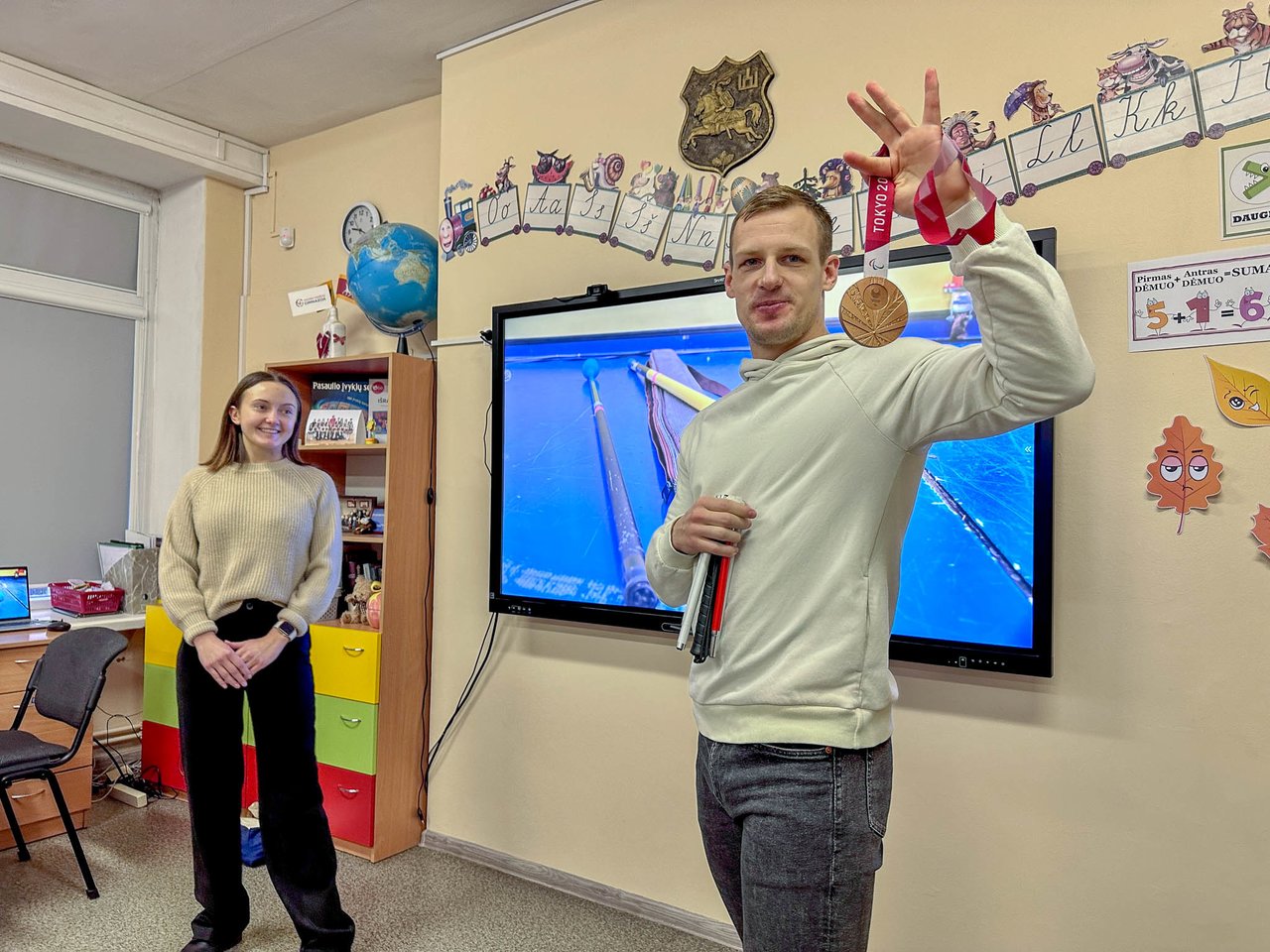 Tituluoto plaukiko pelnyti medaliai keliavo per vaikų rankas, o bene didžiausio susidomėjimo sulaukė spindinti Tokijo paralimpinių žaidynių bronza. Vaikai svarstė: kiek gi sveria šis nelengvas medalis?