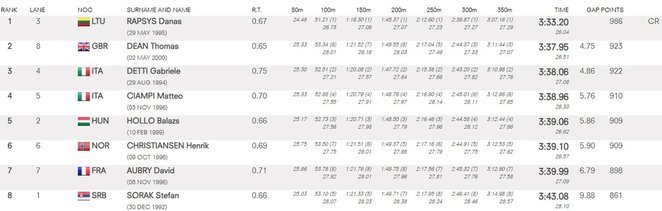 Vienu iš favoritų prieš plaukimą vadintas italas Gabriele Detti (3:38.06) buvo priverstas tenkintis bronzos medaliu.
