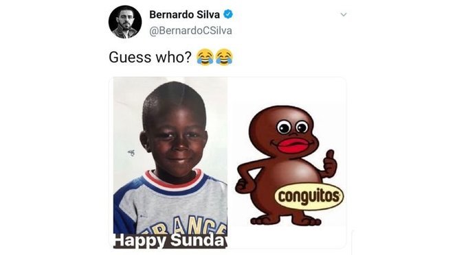 B.Silva tviteryje paskelbė B.Mendy jaunystės nuotrauką, prie kurios taip pat pridėjo ispaniškų šokoladinių saldainių „Conguitos“ nuotrauką ir parašė: „Spėk, kas?“