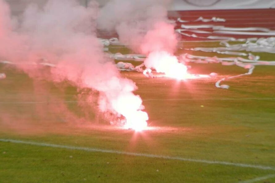 „Skęskite savo gėdoje vieni“, - dar neįpusėjus pirmajam kėliniui su „Riteriais", „Dzūkų tankai“ iškėlė banerį, į aikštę primetė deglų ir paliko tribūną.