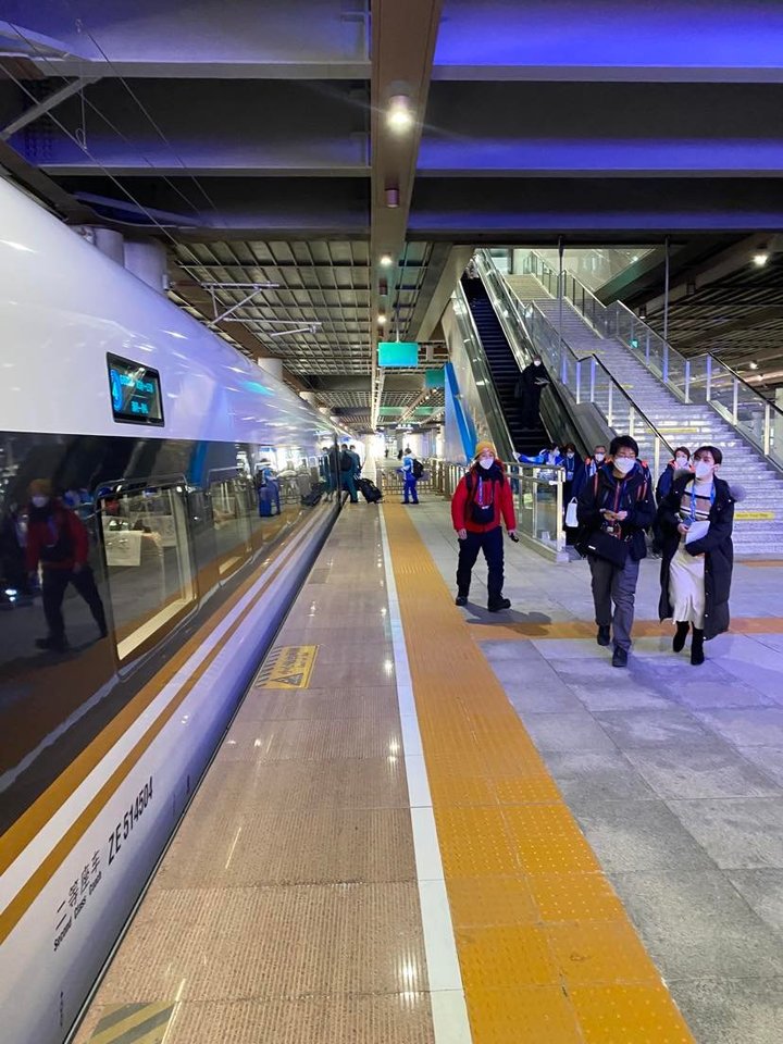 Tiesa, keliauti tenka ne tik autobusais. Štai norint nukeliauti pas mūsų olimpiečius slidininkus ar biatlonininkus teks važiuoti ir greituoju traukiniu. Iš mūsų viešbučio tenka važiuoti vienu autobusu iki pagrindinio žiniasklaidos centro, iš ten persėsti į kitą, kuris nuveža į traukinių stotį, pavadinimu Qinghe. Iš ten laukia 50 min. kelionė į Taizicheng stotį. Iš ten dar vienas autobusas ir maždaug 20 min kelionė iki ZBC centro, nuo kurio laukia dar viena trumpa kelionė (apie 10 min.).