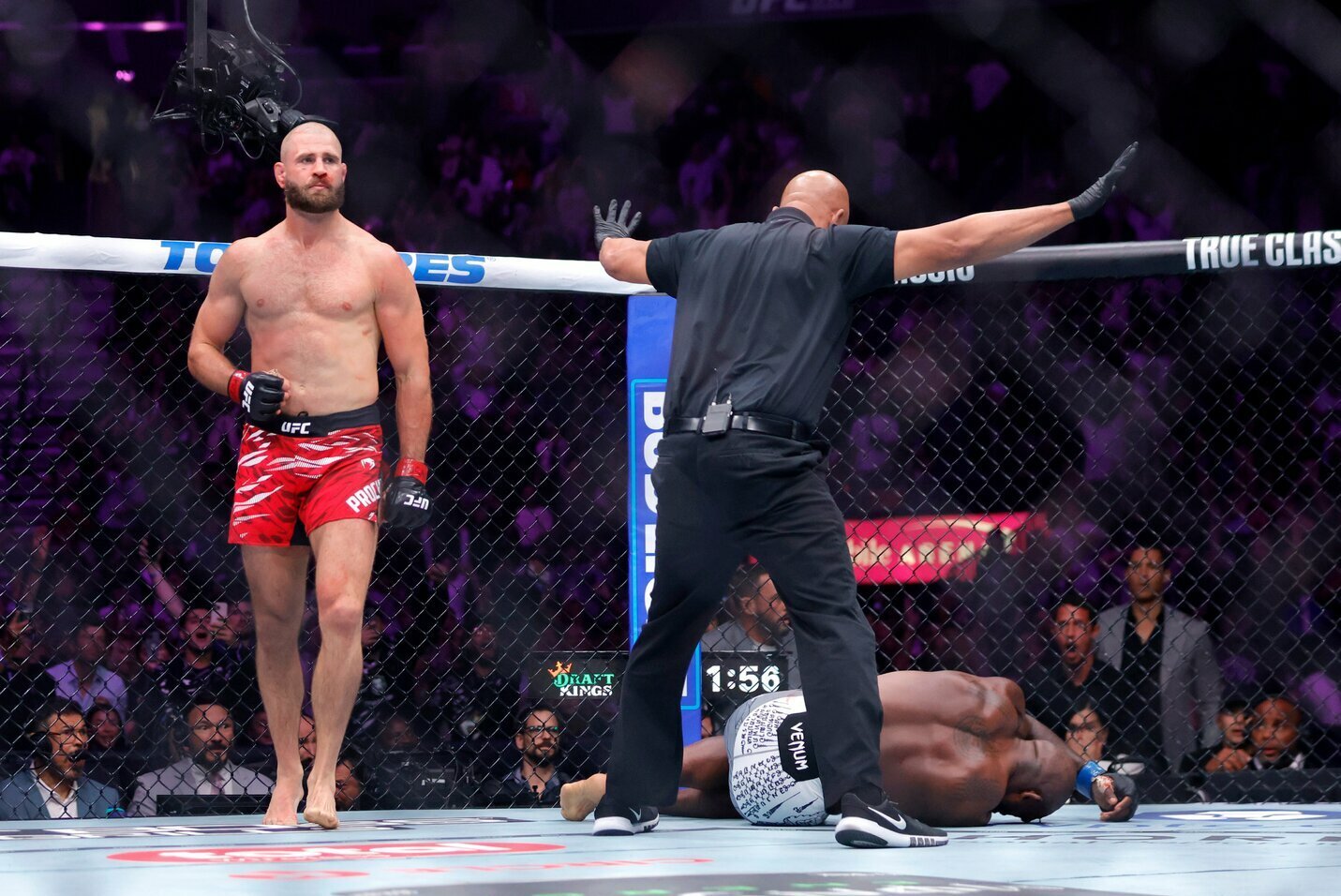 Likus dviem minutėms iki pabaigos, J. Prochazka pataikė alkūne iš apsisukimo, o vos po kelių akimirkų K. Rountree gulėjo ant grindų po itin tikslaus J. Prochazkos kairiojo smūgio.