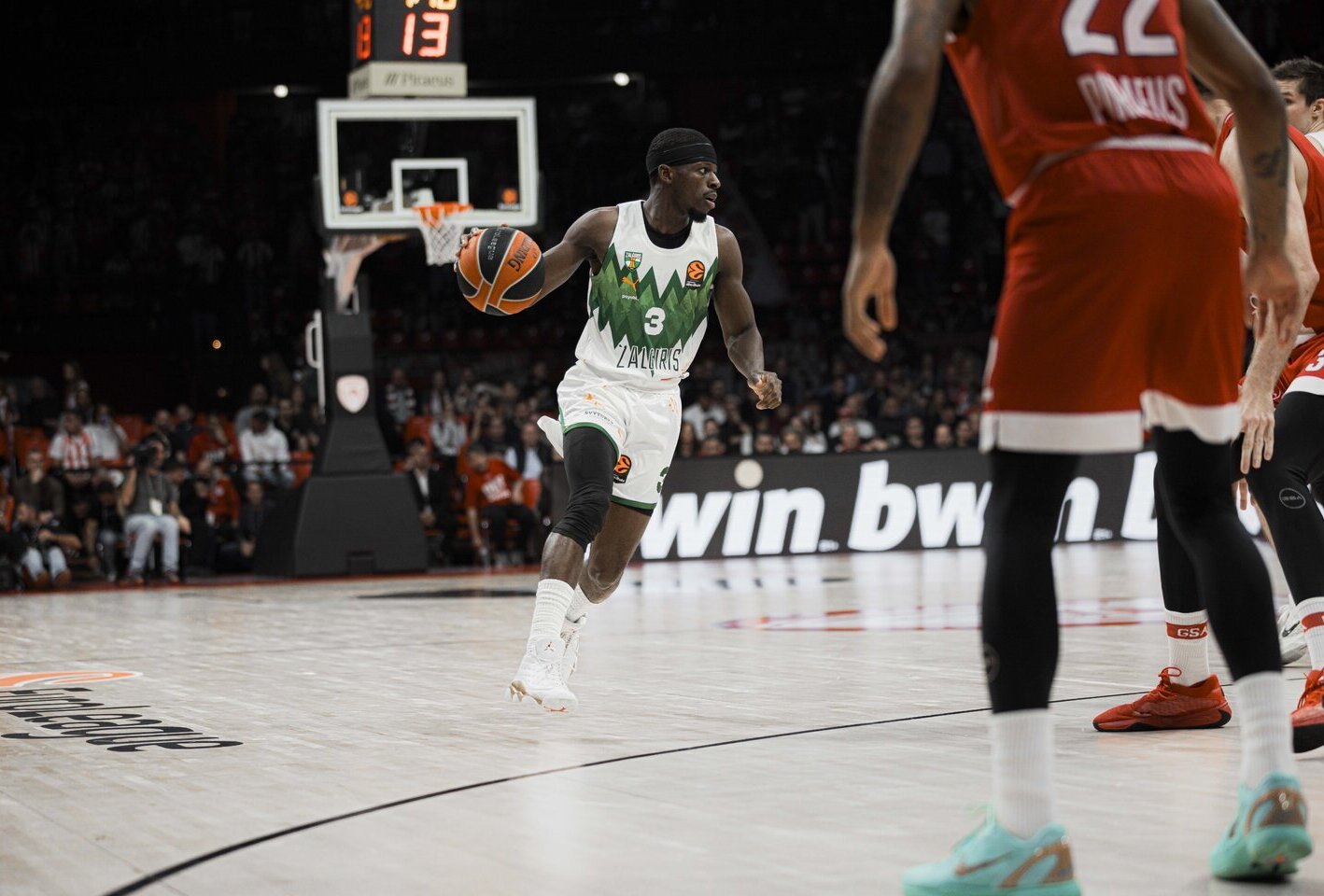 Nors po Igno Brazdeikio ir Edgaro Ulanovo pelnytų taškų „Žalgiris“ pirmavo 6:4, netrukus Tyleris Dorsey rezultatą persvėrė tritaškiu, pelnė dar du taškus, taiklus buvo ir Thomasas Walkupas – 11:6. Pirėjo komanda vis labiau tolo, kadangi rengė spurtą net 15:0, po kurio pirmavo 26:9. Mosesas Wrightas baudomis nutraukė „Žalgirio“ taškų badą (11:26), po pirmojo ketvirčio „Žalgiris“ atsiliko 14:28.