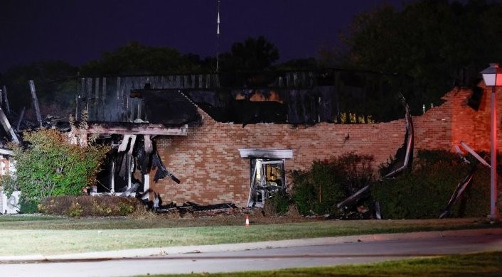 Nuotraukose matyti, kaip didžioji dalis Pastarųjų Dienų Šventųjų Jėzaus Kristaus bažnyčios Grand Blanko mieste, Flinto priemiestyje, pastato virto pelenais.