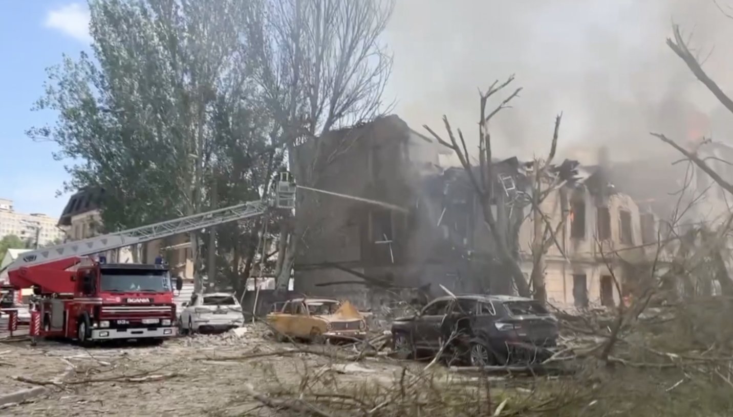 S. Lysakas platformoje „Telegram“ teigė, kad trijų aukštų pastatas buvo iš dalies sugriautas ir 1 000 kvadratinių metrų plote išplito gaisras. Jis taip pat išplatino vaizdo įrašą, kuriame matyti, kaip ugniagesiai gesina pastato griuvėsius.