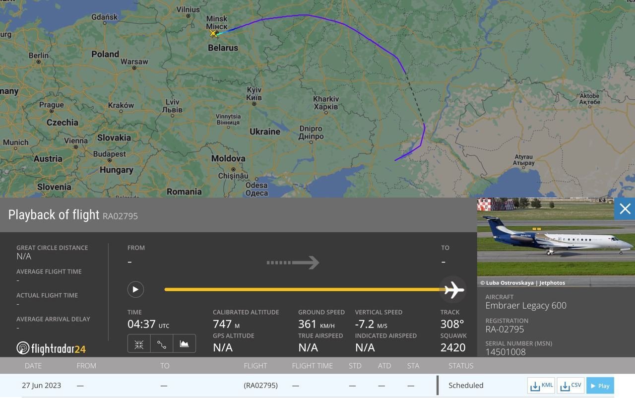 Baltarusijos stebėtojų grupė „Belaruski Hajun“ skelbia, kad antradienio rytą Baltarusijoje nusileido lėktuvas, kuriame – Rusijos privačios karinės kompanijos „Wagner“ vadas Jevgenijus Prigožinas.