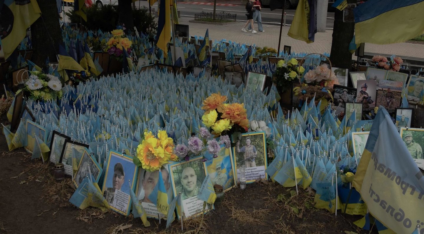 Kyjivo centrinėje – Maidano aikštėje – įrengtas lauko memorialas, kuriame išdėliotos Ukrainos vėliavos ir žuvusiųjų nuotraukos, kurių skaičius su kiekviena Rusijos ataka vis didėja.