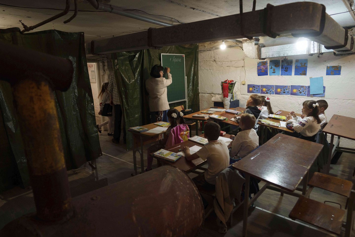 Bobryke, esančiame šiaurinėje Sumų srityje netoli fronto linijos, viena mokykla perkėlė savo klases į rūsį, kad mokiniai, kurių gyvenimą jau paveikė COVID-19 karantinas, galėtų mokytis gyvai.