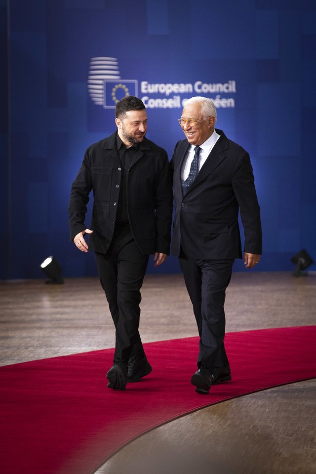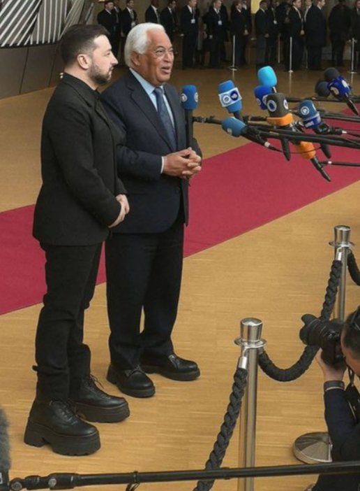 Kitose nuotraukose, kuriose užfiksuotas V. Zelenskio susitikimas su Europos Vadovų Tarybos pirmininku António Costa, prezidento batai atrodo visiškai kitaip.