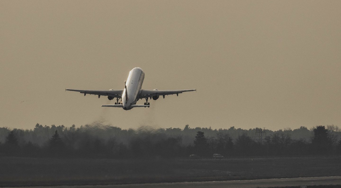 Nuotrauka, daryta po lėktuvo nusileidimo, rodo, kad regioninis lėktuvas „Embraer ERJ 175“ stovi atokiau nuo terminalo, o aplink jį – du gaisriniai automobiliai.