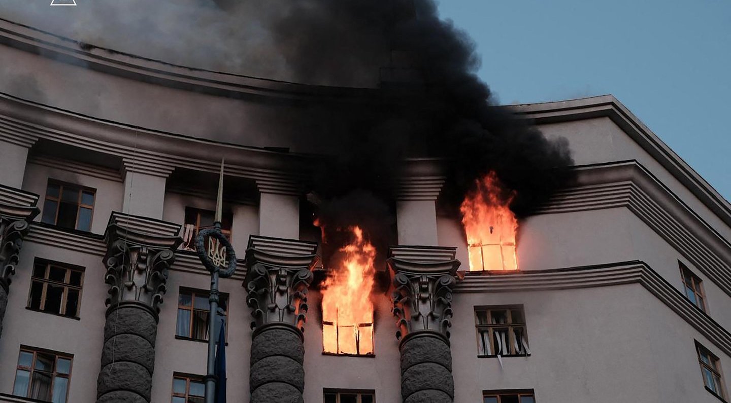 Manoma, kad tai pirmas kartas, kai Rusija atakavo šį beveik prieš šimtmetį pastatytą dešimties aukštų sovietinio stiliaus pastatą su įspūdingu pusapvaliu fasadu.
