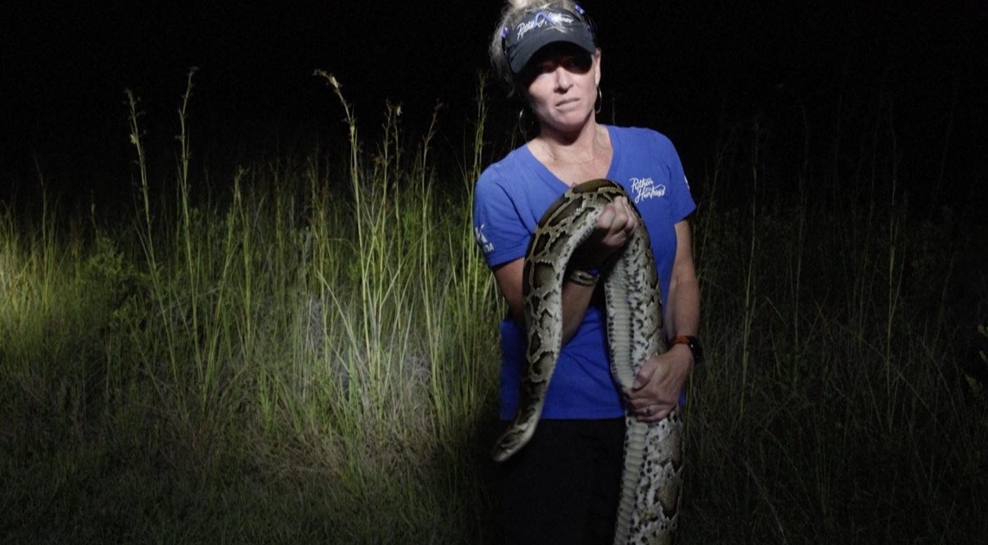 Amerikietė Amy Siewe Floridoje plikomis rankomis kasdien gaudo milžiniškus pitonus. Valstijoje nevaldomai išaugus invazinei Birmos pitonų populiacijai, jų prisiveisė jau pusė milijono.