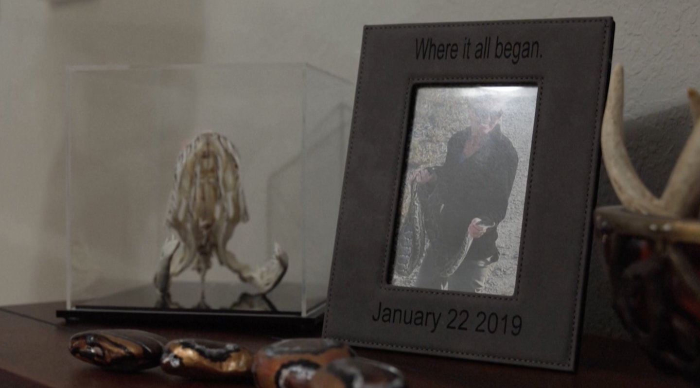 Skaičiuojama, kad Floridoje šiuo metu prisiveisė bemaž pusė milijono Birmos pitonų. Medžiotojos namuose nuotrauka – prisiminimas apie pirmąjį sumedžiotą pitoną.