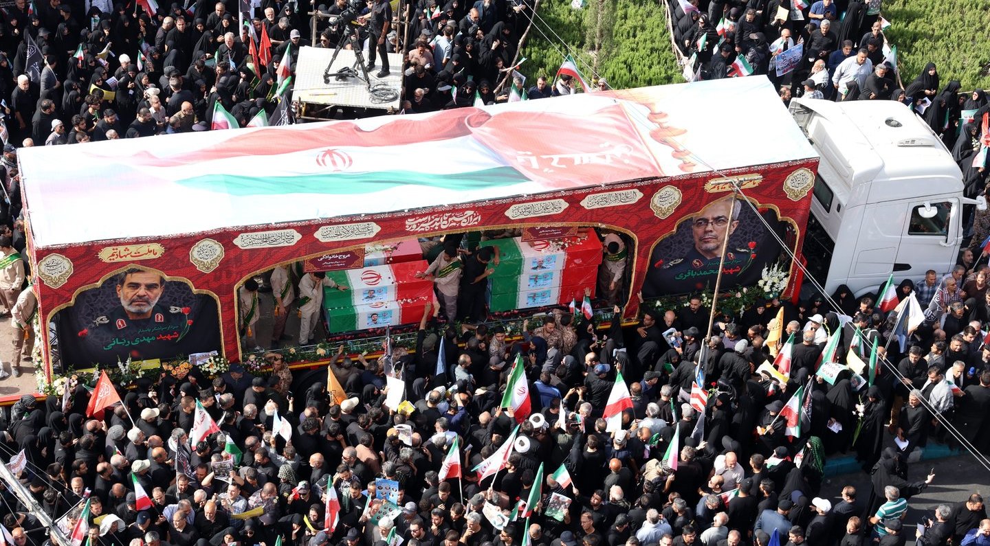 Vaizduose iš laidotuvių matyti karstai su Irano vėliavomis ir žuvusių vadų portretais su uniformomis Teherano centre.