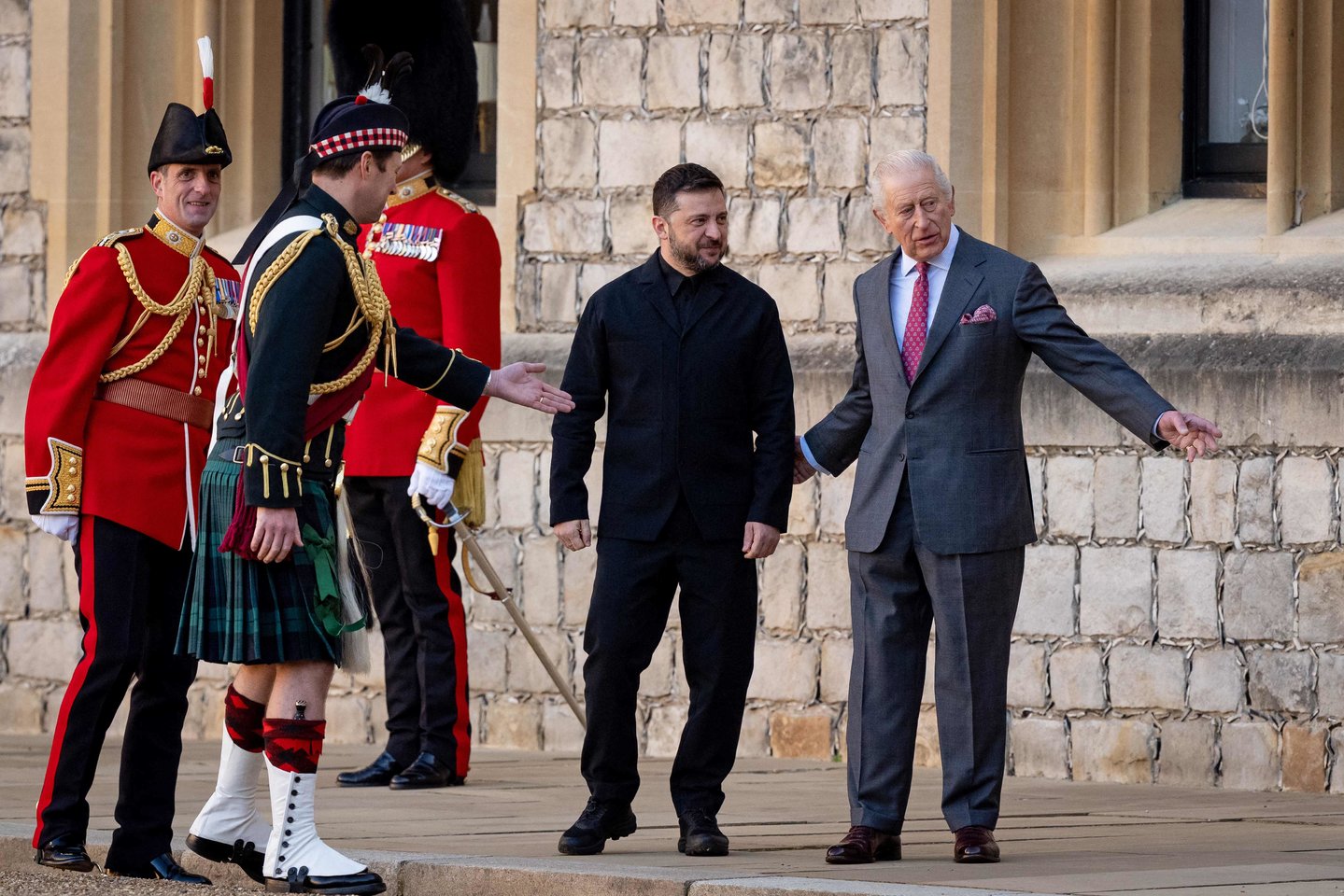 V. Zelenskis atvyko susitikti su Didžiosios Britanijos karaliumi Vindzoro pilyje. Jam buvo suteiktas karališkas pasveikinimas, o įžengus į pilies kiemą, buvo grojamas Ukrainos himnas, rašo „Sky News“.