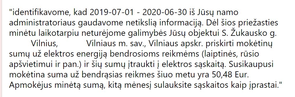 „Elektros tiekėjas susisgribo ir atsiuntė laišką, kuriame teigia, kad nuo 2019 metų vasaros iki 2020 metų vasaros nebuvo galimybės priskirti mokėjimų už bendrosioms reikmėms (laiptinės, rūsio, apšvietimo ir pan.) sunaudotą elektrą. Skola siekia 50 eurų.