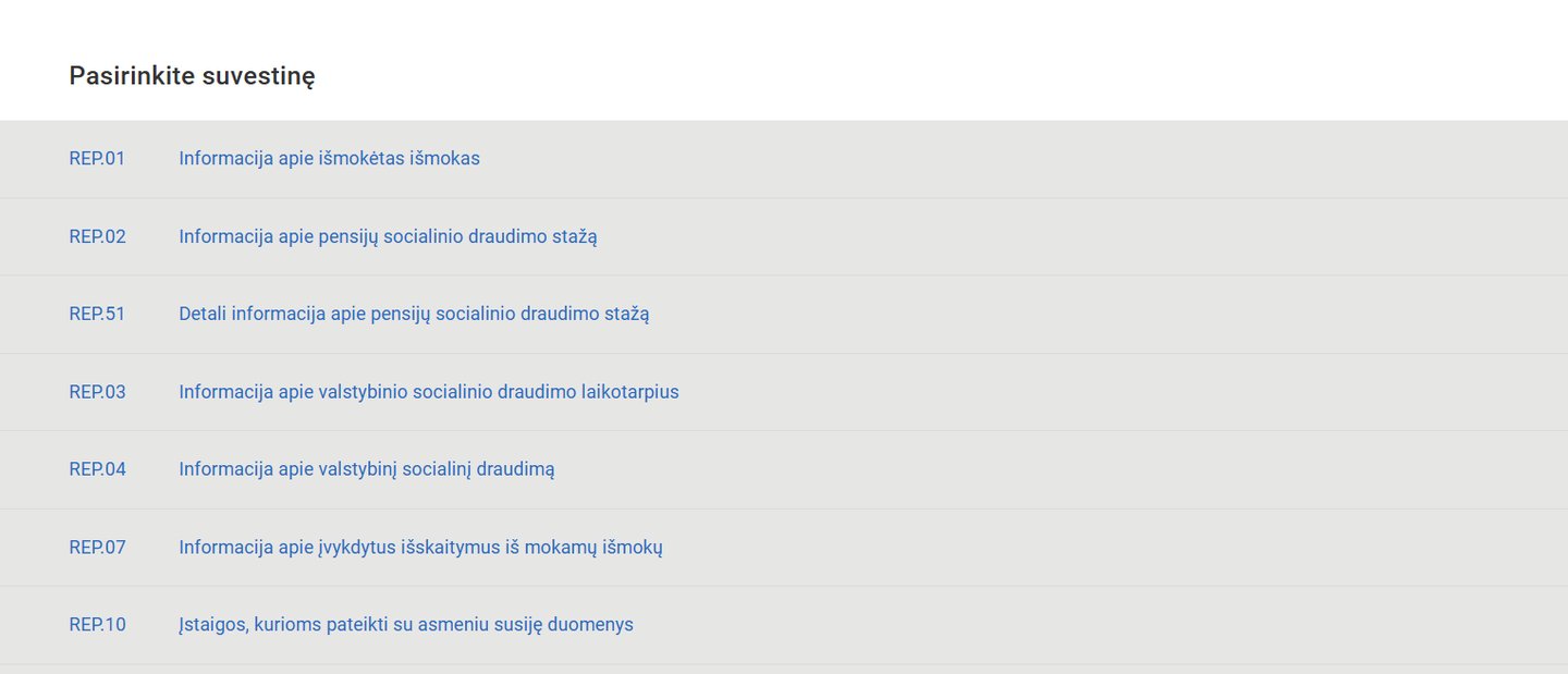 „Prisijungus prie paskyros meniu juostoje yra skiltis „Mano suvestinės“. Reikia paspausti „Nauja suvestinė“ ir pasirinkti norimą suvestinę iš pateikto sąrašo.