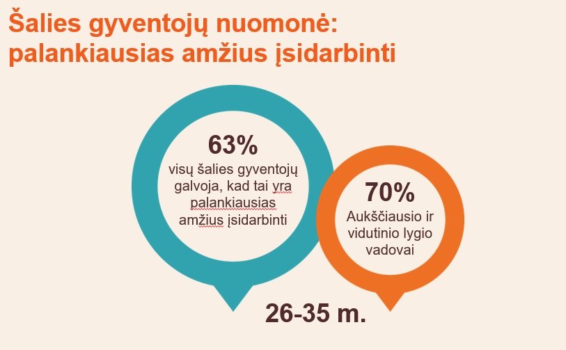 Atlikta šalies gyventojų apklausa rodo, kad didžioji dalis apklaustųjų (63 proc.) įsitikinę – geriausias galimybes darbo rinkoje turi 26–35 m. amžiaus žmonės. Maždaug kas septintas respondentas (14 proc.) mano, kad palankiausias amžius darbo rinkoje yra 36–45 metai. Tuo metu tik 7 proc. gyventojų mano, kad visų amžiaus grupių darbuotojų galimybės panašios.