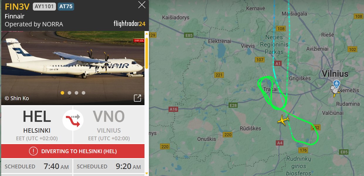 Tačiau, priartėjęs prie Vilniaus oro uosto, lėktuvas apsuko kelis ratus ore ir vėl pradėjo skristi atgal Helsinkio link.