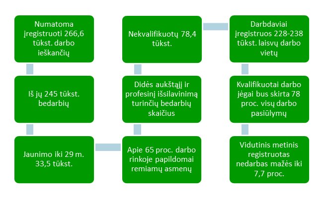 Numatoma, kad bedarbių struktūroje apie 65 proc. bus darbo rinkoje papildomai remiami asmenys, vyresnių kaip 50 metų darbo ieškančių žmonių – 40 proc., jaunimo iki 29 metų – 16 proc. ilgalaikių bedarbių dalis, palyginti su 2017 metais, turėtų sumažėti 1–2 proc. punktais iki 25 proc.