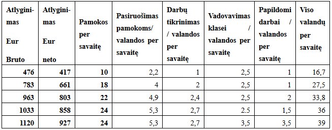 Lentelėje pateiktas skaičiavimo pavyzdys, pritaikytas 15 darbo metų stažą ir mokytojo metodininko kategoriją turinčiam pedagogui. Valandos papildomiems darbams, vadovavimui klasei gali šiek tiek kisti.