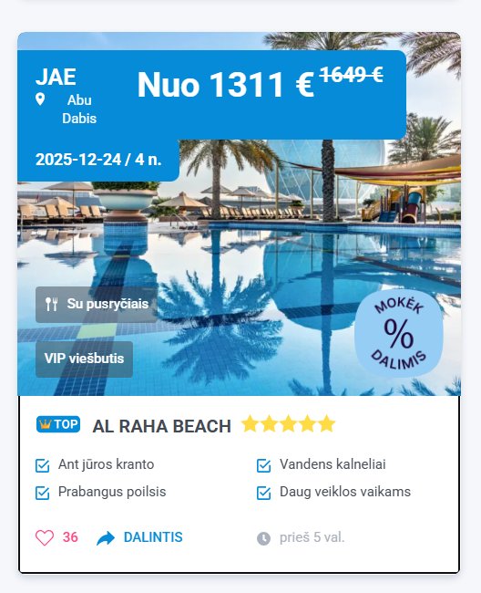 Be to, galima rasti ir nemažai kelionių pasiūlymų į žymųjį Dubajų (JAE). Pavyzdžiui, už 967 eurus asmuo gali čia praleisti 4 naktis. Į kainą yra įskaičiuoti skrydžiai, apgyvendinimas ir pusryčiai.