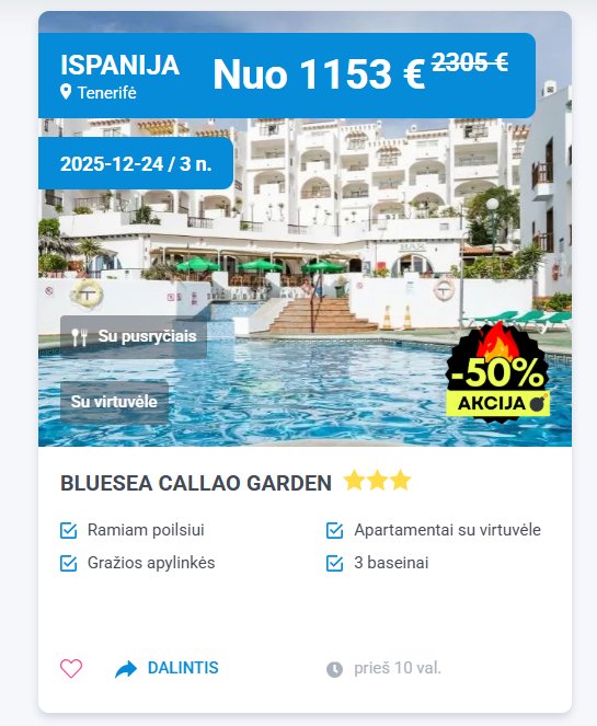 Į šią kainą įeina skrydžiai ir apgyvendinimas, tačiau neįskaičiuotas maitinimas.