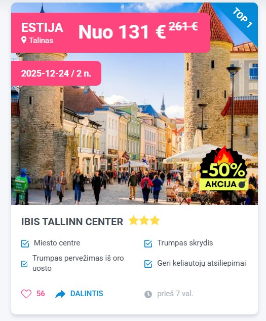 Pavyzdžiui, norintys trumpo pabėgimo per didžiąsias žiemos šventes jau Šv. Kūčių dieną gali išvykti į Taliną (Estija) ir ten praleisti 2 naktis. Už tokią kelionę reikėtų sumokėti 131 eurą, o į kainą įeitų skrydžiai bei apgyvendinimas su pusryčiais.