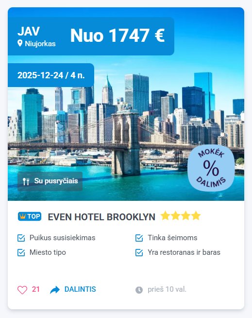 Pavyzdžiui, su pritaikyta nuolaida už 1 601 eurą yra siūloma 4 naktis praleisti Niujorke (JAV). Į šią kainą įskaičiuoti skrydžiai, nakvynė ir pusryčiai viešbutyje.