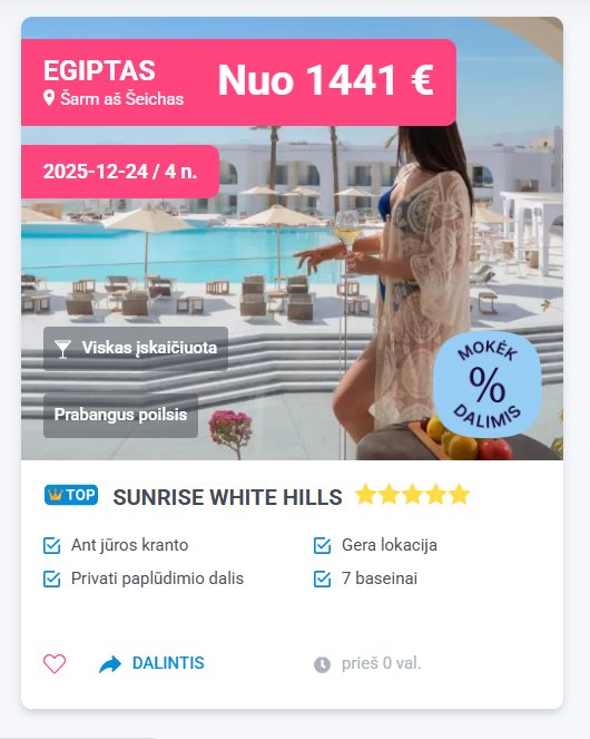 Tuo metu už 1 441 eurą galima įsigyti išvyką į saulėtąjį Egiptą. Už tokią kainą įsigyjami skrydžiai, apgyvendinimas ir „viskas įskaičiuota“ maitinimas.