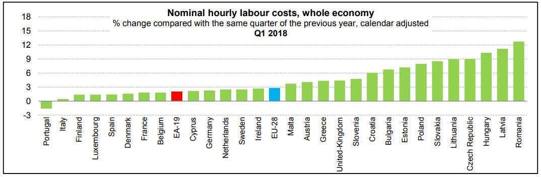 Labiausiai valandiniai darbo kaštai padidėjo Rumunijoje (12,7 proc.), Latvijoje (11,2 proc.), Vengrijoje (10,3 proc.) bei Čekijoje ir Lietuvoje (po 9 proc.). Tačiau atlyginimai didėjo ne visur. Iš duomenų matyti, kad Portugalijoje 1,5 proc. valandiniai darbo kaštai net sumažėjo.
