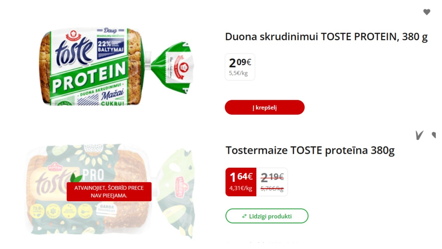 Galiausiai duonos kainos yra gana panašios abejose šalyse. Pavyzdžiui, „Toste“ prekinio ženklo duona skrudinimui Lietuvoje kainuoja 2,09 euro, o Latvijoje – 2,19 euro.