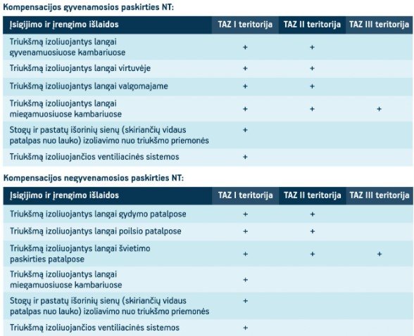 - TAZ I teritorijoje kompensuojamos triukšmą izoliuojančių langų, skirtų gyvenamiesiems kambariams, virtuvėms, valgomiesiems bei miegamiesiems kambariams, įsigijimo ir įrengimo išlaidos; stogų ir pastatų išorinių sienų (skiriančių vidaus patalpas nuo lauko) izoliavimo nuo triukšmo priemonių įsigijimo ir įrengimo išlaidos; triukšmą izoliuojančių ventiliacinių sistemų įsigijimo ir įrengimo išlaidos;