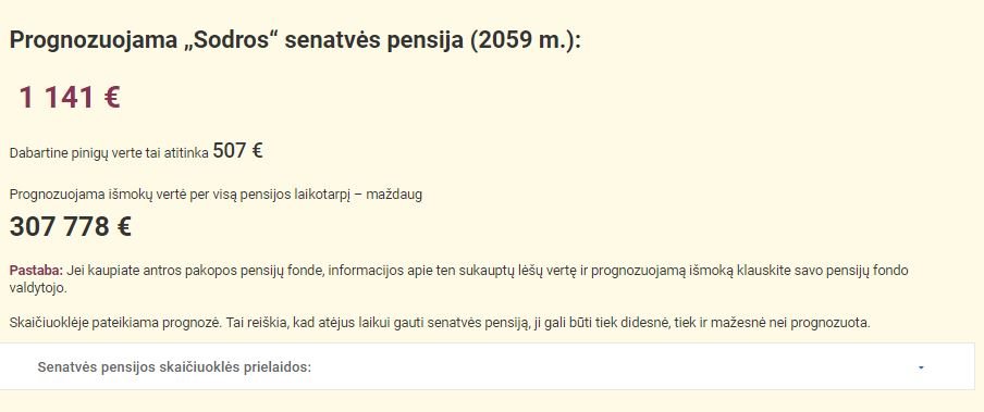 Taip pat gyventojas sužinos, kiek iš viso „Sodra“ jam išmokėtų pensijos per vidutinį senatvės pensijos laikotarpį. Remiantis Lietuvos statistikos departamentu, sulaukę 65-erių šalies gyventojai, tikėtina, vidutiniškai gyvens ir senatvės pensiją gaus dar 17 metų.