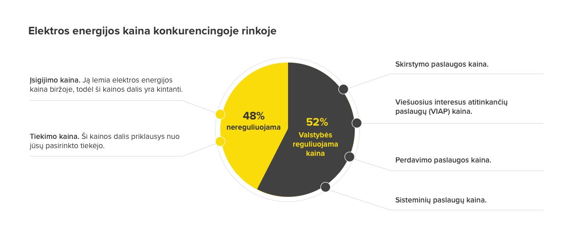 Elektros kainą sudaro daug dedamųjų: elektros perdavimo, skirstymo, VIAP (viešuosius interesus atitinkančios paslaugos) kainų dedamosios, mokesčių ir rinkliavų - labai panašiai kaip ir degalų litro kainoje. Juk pačių degalų (kaip prekės) kaina visoje 1 litro kainoje sudaro tik tam tikrą dalį, visą kitą sudaro valstybės mokesčiai, akcizai, degalų prekiautojų mokesčiai ir pan. Taip ir elektros kainoje, svarbių valstybei elektros tinklų išlaikymas ir kitų paslaugų dalis elektros kainoje sudaro apie 52 proc., o pačios elektros kainos dalis ir jos tiekimo paslaugos kaina sudaro apie 48 proc. Būtent ši dalis nebus reguliuojama VERT, o šios dalies kainą lems elektros biržos kaina ir elektros tiekėjų konkurencija.