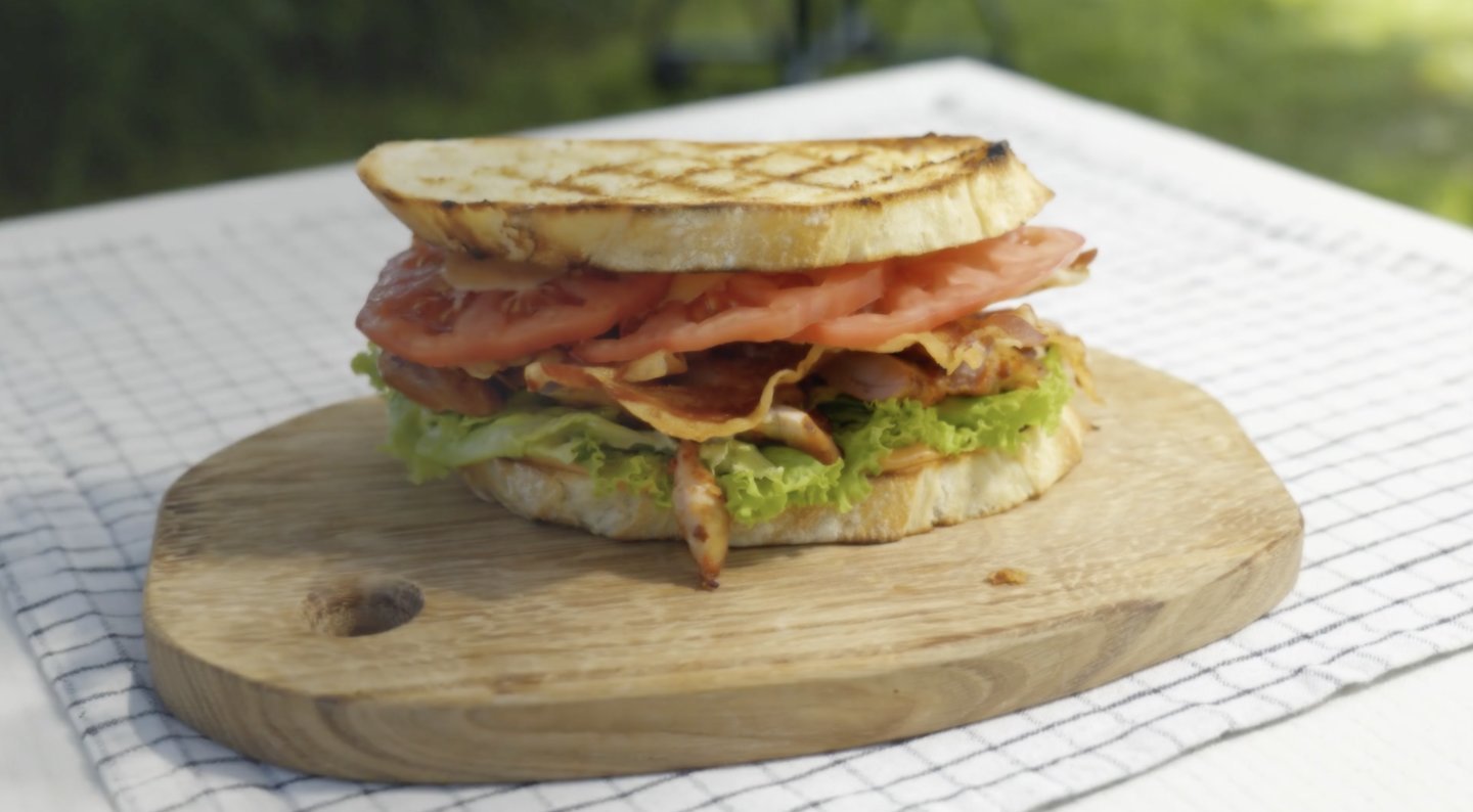 9. Ant skrudintos duonos užtepkite Sriracha majonezo, dėkite vištieną, traškią šoninę, jūsų mėgstamus salotų lapus, gerai prinokusio pomidoro grežinėlius, ant viršaus dėkite dar vieną skrudintos ir Sriracha majonezu pagardintos duonos riekelę ir džiaukitės pačiu skaniausiu BLT sumuštiniu pasaulyje!