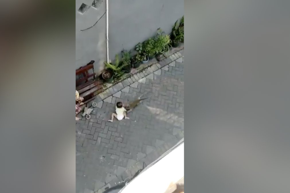 Tačiau vėliau prasideda nemalonioji dalis. Gyvūnas pagriebęs mergaitę ėmė ją tempti šaligatviu. Visą incidentą nufilmavo balkone stovėjęs vyras, kuris netrukus ėmė šaukti pagalbos.