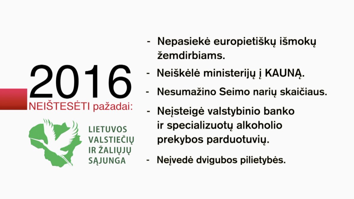 2016-aisiais darnios Lietuvos idėja patikėję tautiečiai leido Ramūno Karbauskio ir Sauliaus Skvernelio Lietuvos valstiečių ir žaliųjų sąjungai (LVŽS) triuškinamai laimėti Seimo rinkimus. Štai, ką žadėjo valdančios daugumos vedliai prieš ketverius metus, bet pažadų taip ir neištesėjo: