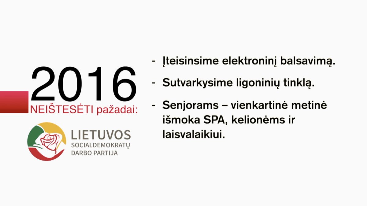 2016-aisiais socialdemokratai rinkėjus viliojo šūkiu: „Girdim. Matom. Darom“. Reklaminiuose klipuose rinkėjai buvo gąsdinami amžinu socialdemokratų priešu konservatoriais. Bet štai praėjus metams socialdemokratų partija skilo – dalis socialdemokratų tapo socialdarbiečiais ir įkūrė Lietuvos socialdemokratų darbo partiją. Štai abiejų partijų per ketverius metus neištesėti pažadai: