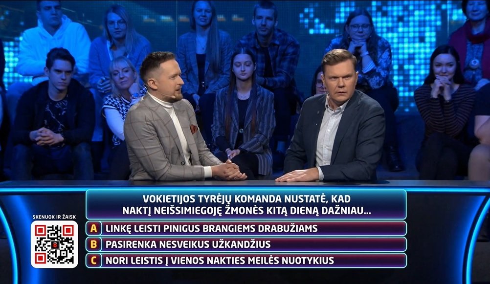 Kartu su Mantu Katleriu vienoje komandoje žaidęs Mindaugas Stasiulis rinkosi klausimą, kurį apibūdo žodis nemiga, o klausimas skambėjo taip: Vokietijos tyrėjų komanda nustatė, kad naktį neišsimiegoję žmonės kitą dieną dažniau: