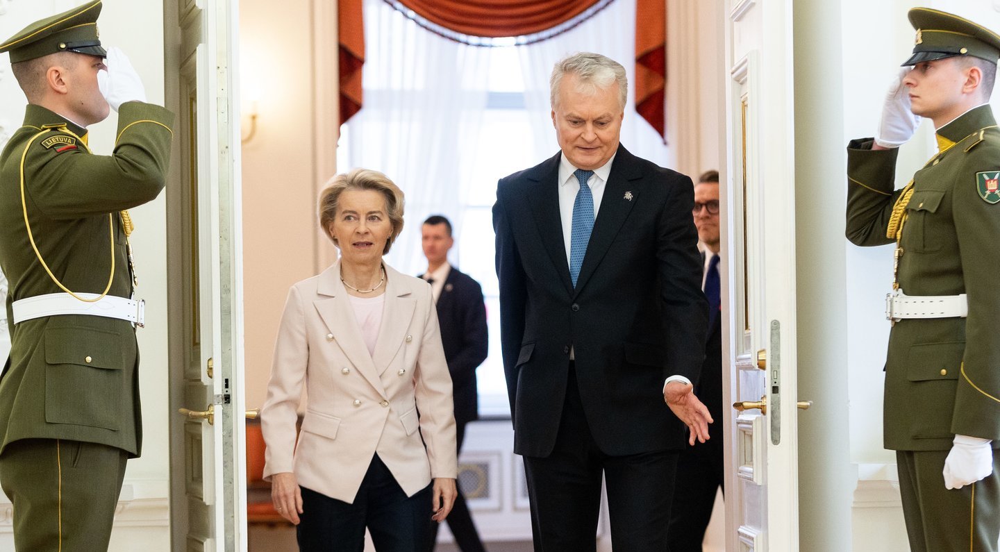 „Europa pilnai palaiko Lietuvą, kaip fronto valstybę. Jūs ribojatės su Rusijos Kaliningradu, su Baltarusija. Patiriate geopolitinį ir ekonominį spaudimą, kaip ir nuolatines karines bei hibridines grėsmės“, – teigia atvyksta Europos Komisijos pirmininkė Ursula von der Leyen.