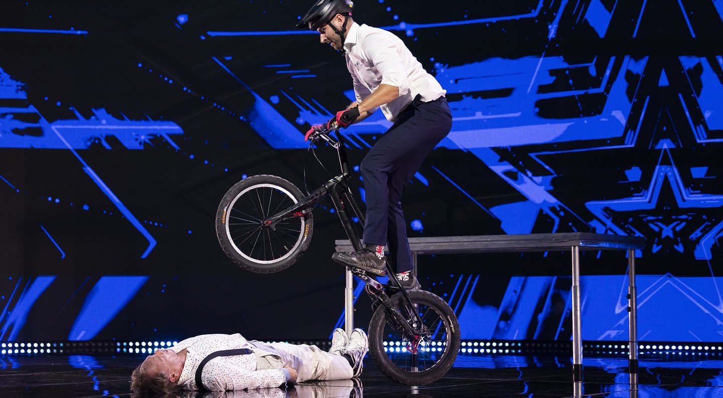 Bet tuo jo pasirodymas dar nesibaigė – Renatas pakvietė ant scenos užlipti Marijoną Mikutavičių. Jis taip pat atsigulė ant scenos ir Renatas su dviračiu pradėjo šokinėti per teisėją. Erzindamas ir gąsdindamas M. Mikutavičių Renatas atliko įspūdingus kvapą gniaužiančius triukus.