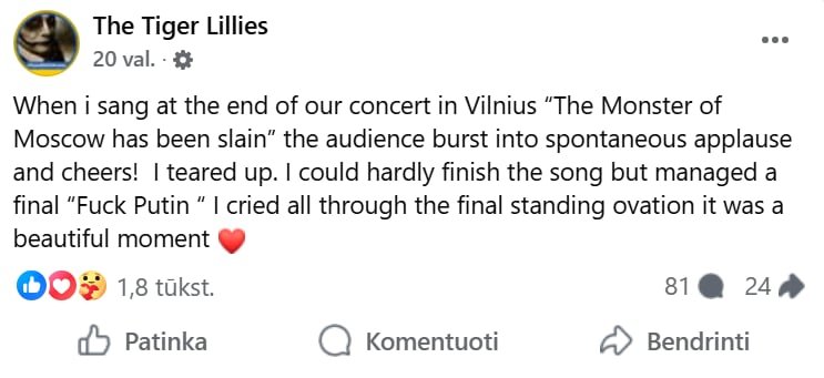 Po pasirodymo grupė savo „Facebook“ paskyroje pasidalijo jautria žinute su politiniu akcentu, kurioje atskleidė, kaip juos paveikė Vilniaus publika.