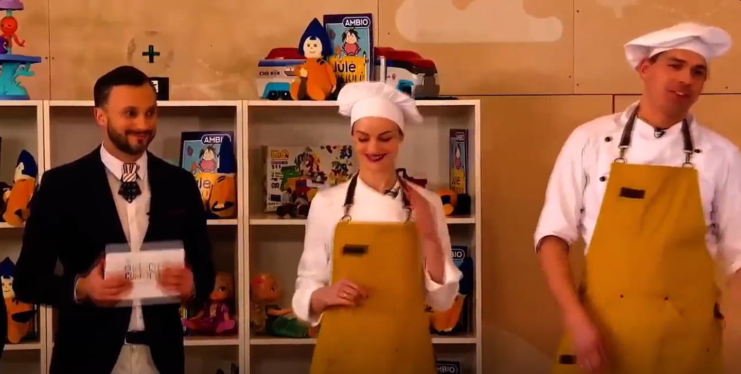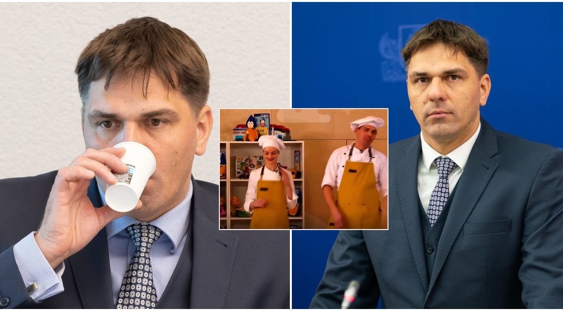 Laidoje buvęs kultūros ministras Ignotas Adomavičius pasirodė vilkėdamas virtuvės šefo aprangą ir atliko nuotaikingą dainą.